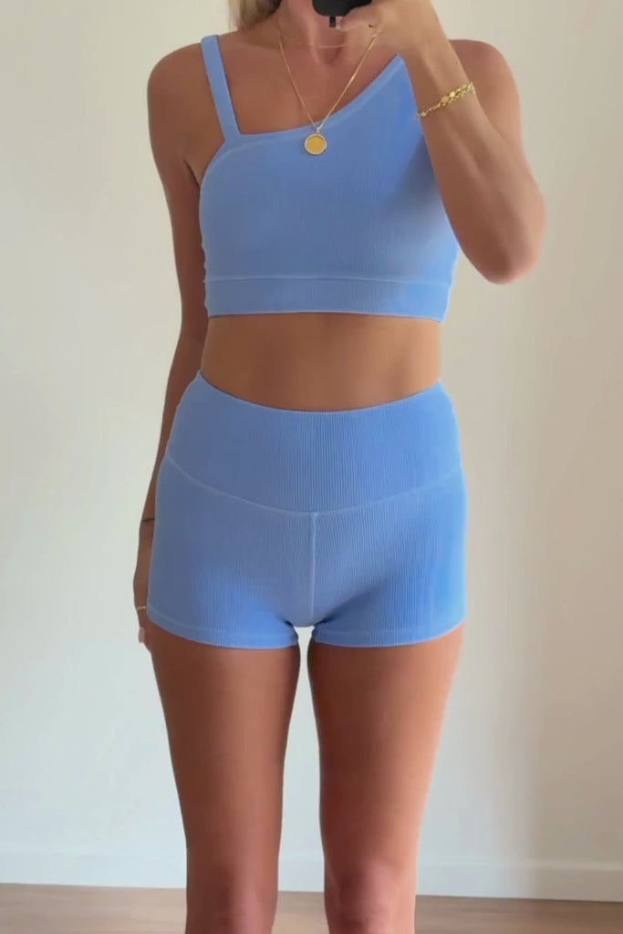 A soft waffle textured crop in ocean blue, designed to sculpt and move with you. Features an asymmetric neckline with an elasticated left shoulder strap, slim waistband hem, and logo badge at the centre back. Perfect for the active woman.